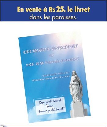 Le Comité Liturgique a mis en vente un livret souvenir de la messe d’ordination épiscopale de Mgr Durhône. Ce livret, élaboré par le père Jean-Claude Véder et son équipe, est en vente à Rs 25 dans les paroisses et sera également en vente à Marie-Reine-de-La-Paix le 20 août prochain. 20 000 exemplaires ont été imprimés.
