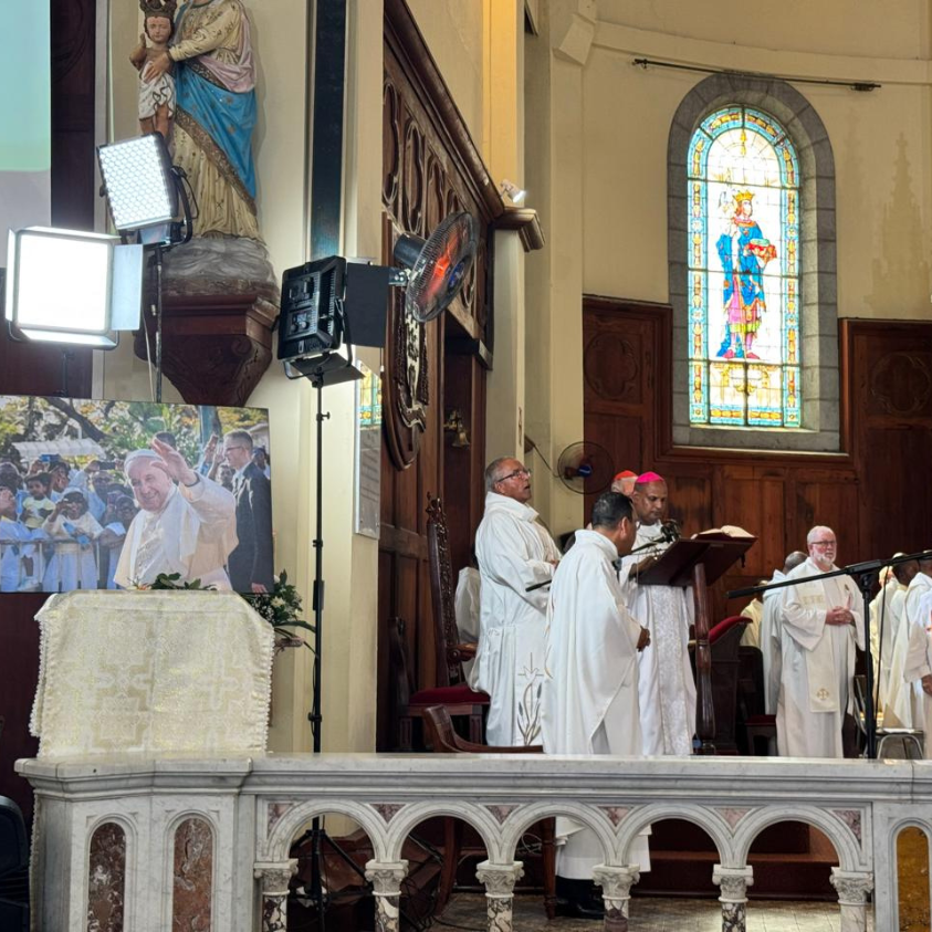 Chers frères et sœurs de Maurice, d’Agalega et des Chagos, en reprenant ce chant qui nous rappelle que depuis samedi dernier, l’Eglise célèbre et proclame ces paroles qui sont au cœur de la foi chrétienne : « Christ a souffert sur la Croix, Christ est mort, Christ est ressuscité. Christ est vivant Alleluia ! ». Et c’est dans ce temps de Pâques que le lundi 21 avril 2025, le Pape François a fait son passage de la mort à la vie. Bien qu’il y ait de la tristesse de voir partir le Pape François, notre Papa, nous sommes convaincus que nous ne sommes pas orphelins. Le Christ Vivant et Ressuscité continue de guider l’Eglise. En célébrant la messe de Requiem, le Diocèse de Port- Louis veut célébrer et honorer la mémoire du Pape François.