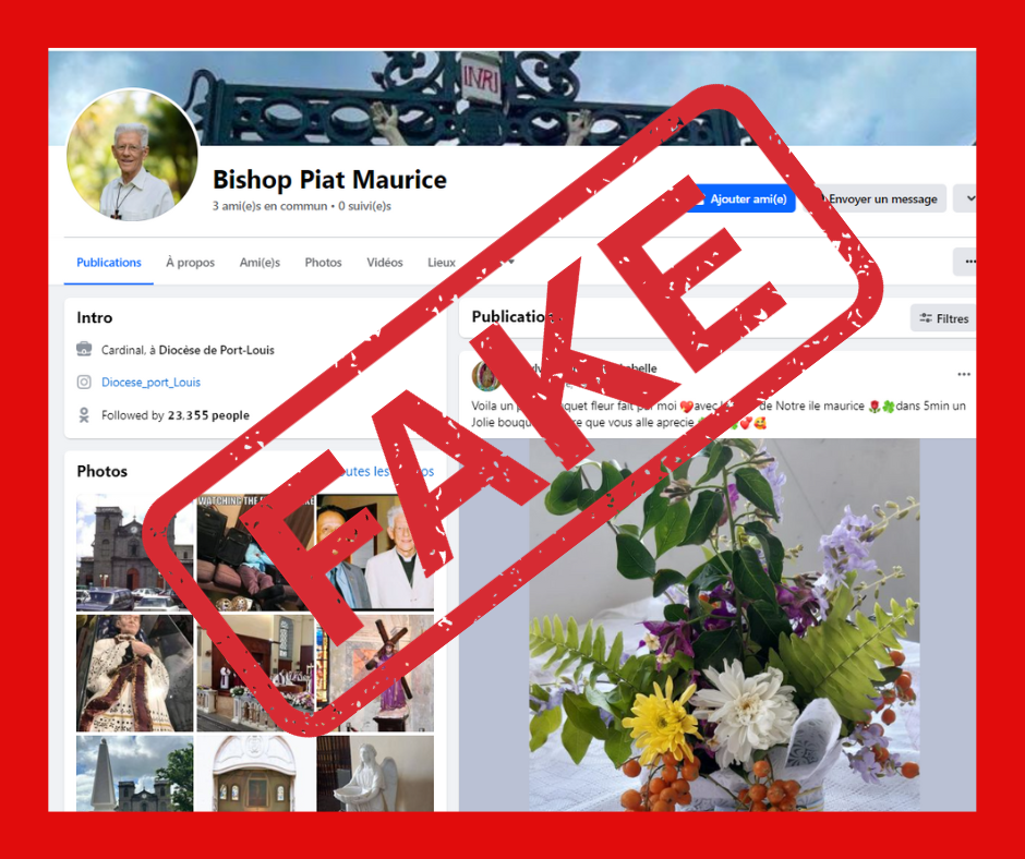L’évêché informe le public internaute qu’un individu se faisant passer pour le Cardinal Maurice E. Piat a créé un compte facebook au nom de « Bishop Piat Maurice ». Cette personne affiche des photos du Cardinal et sollicite les utilisateurs de Facebook pour qu’ils communiquent leur numéro de téléphone.