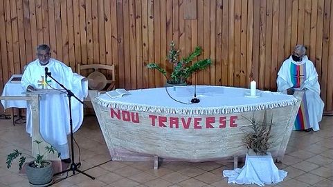 Get bien : l’autel lor ENN BATO ki represant bann bato negrier ki finn transport depi l’Afrik, par million bann esklav à traver l’Océan pendant 13 siècles.? zezi dan levanzil traver la mer pou zoinn avek nou. Pli divant en enn phare :: la limièr lesperance dans marée noir. En ici kot nou lir la Parol, enn gouverail qui donn nou la direction pour aller.